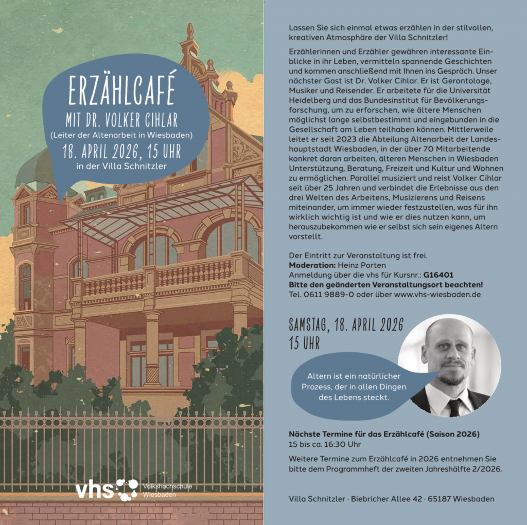 Am 18. April ist Volker Cihlar, Leiter der Abteilung Altenarbeit der Landeshauptstadt Wiesbaden, im Erzählcafé in der Villa Schnitzler zu Gast.